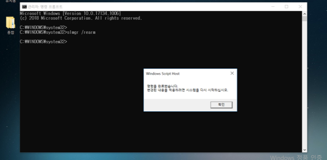 ② 명령어창에서 "slmgr /rearm"을 입력하고 Enter을 누릅니다. 그러면 아래와 같이 명령이 완료되었다는 창이 뜨고 재부팅하라는 안내가 뜹니다.